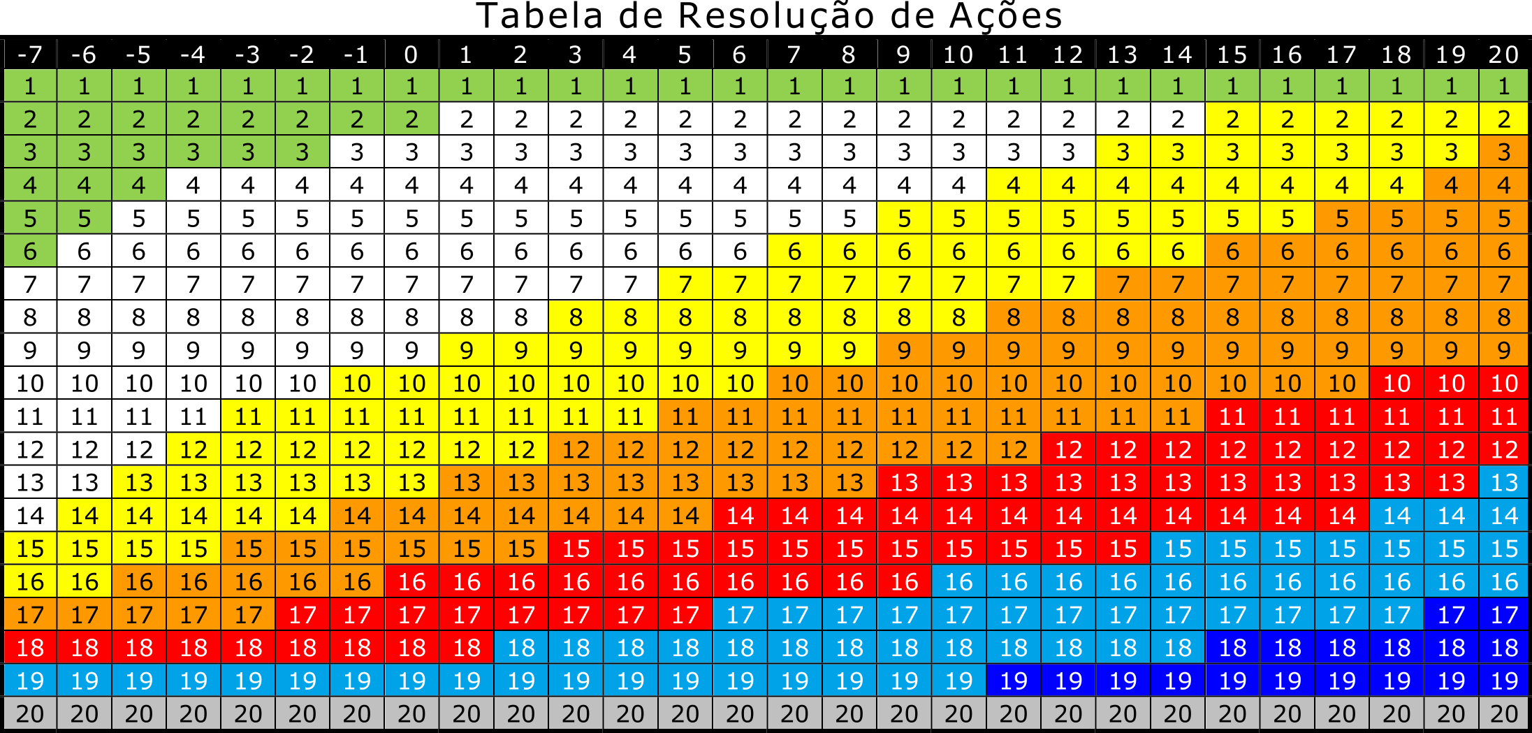 Nesta cor, estarão inseridos números. Agora só resta fazer um sorteio, jogando 1d20. Caso você consiga um resultado igual ou maior que o menor dos números indicados por sua cor, você obteve sucesso. Caso seu resultado seja menor, você fracassou na tentativa.