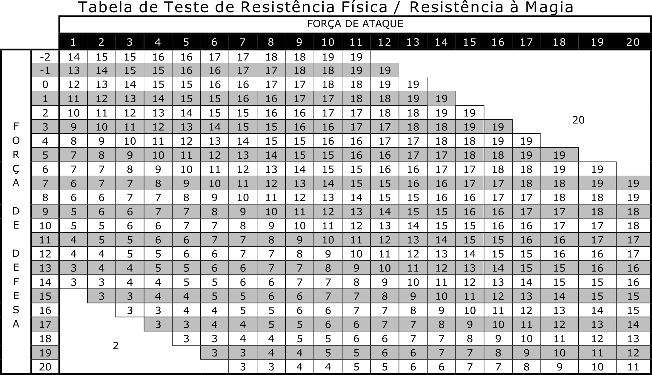 A tabela a seguir simplifica os cálculos e mostra o “gasto” de pontos de Atributo para a obtenção do valor desejado conforme o Atributo Inicial do personagem e Atributo Final desejado.